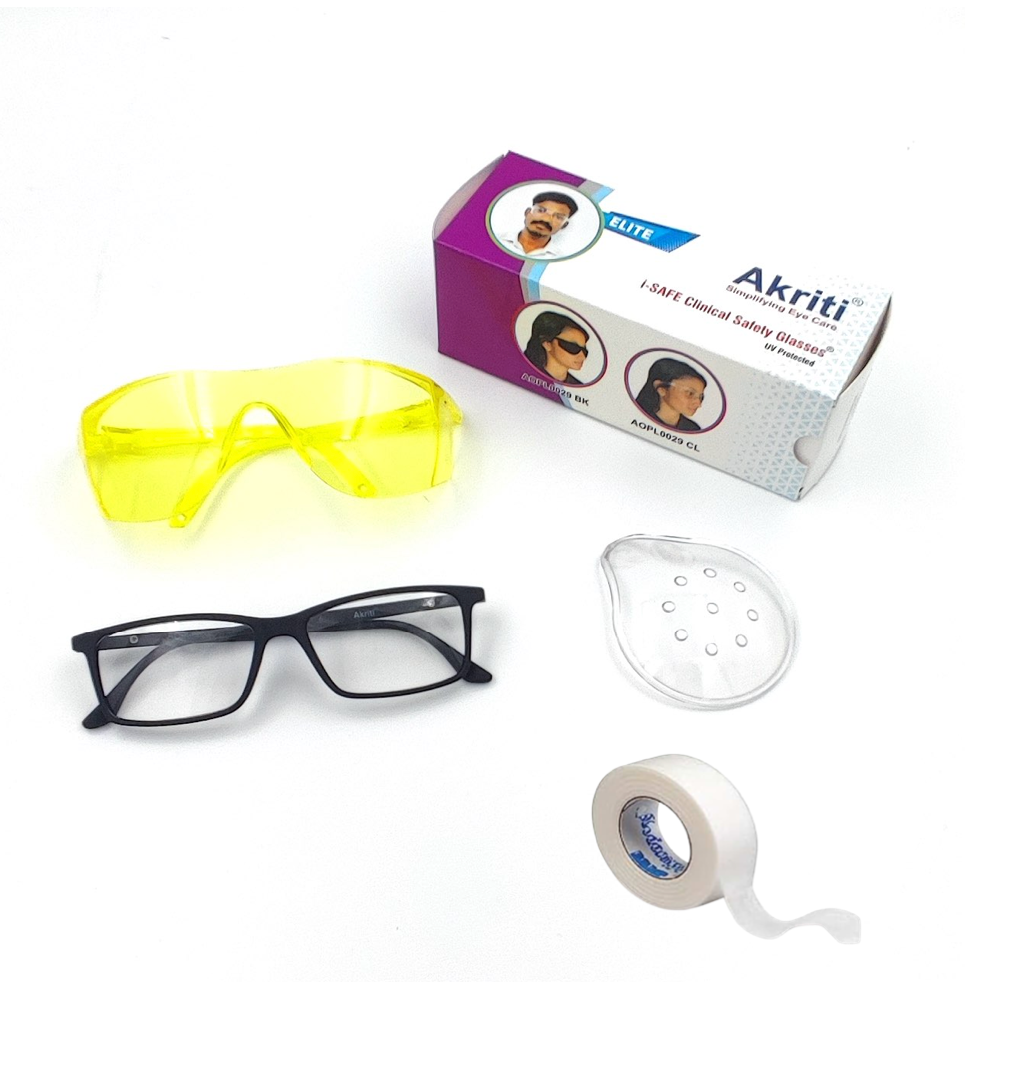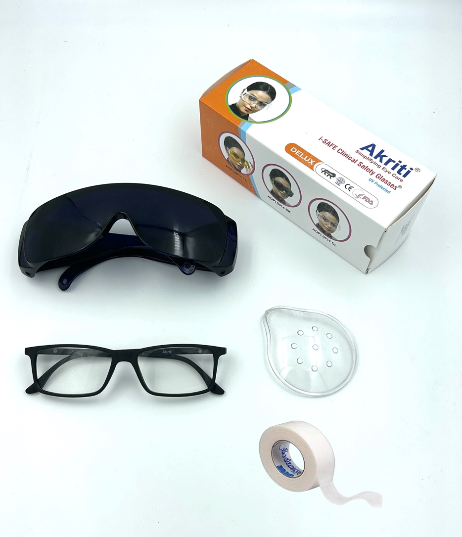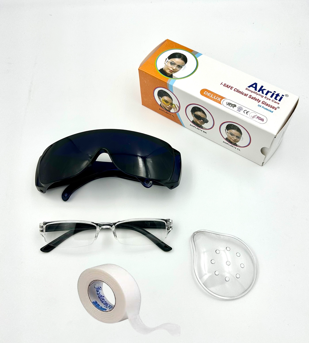 Akriti Ophthalmic Pvt Ltd provides ready-to-use post-operative kits for cataract, LASIK, and refractive surgery recovery. Designed for comfort and safety, each kit includes UV400 protective glasses, impact-resistant polycarbonate eye shields, and hypoallergenic tape, with optional reading glasses and custom branding. Trusted by hospitals and outreach programs, our kits are ISO 13485 and WHO-GMP certified, reflecting Akriti’s zero-defect commitment.