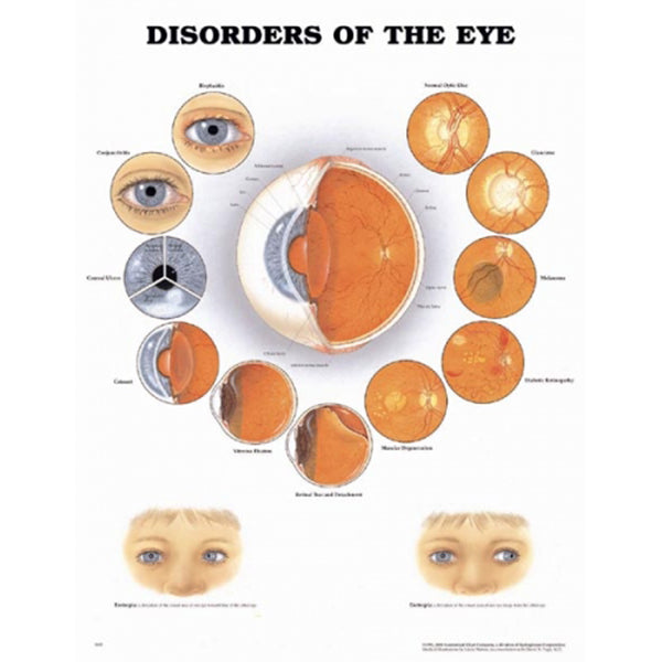 Illustrations of major eye diseases: Blepharitis, Conjunctivitis, Normal Optical Disc vs Glaucoma, Melanoma, Diabetic Retinopathy, Macula Degeneration, Retinal Tear and Detachment, Vitreous Floaters,Corneal Ulcers, Cataract plus overall illustration of the eye showing Optic Nerve, Retina, Macula Lutea, Choroid, Sclera, Superior and inferior rectus muscles, Ciliary body, lens, iris, Cornea, and Schlemm's canal. Additonal drawings illustrate Esotropia and Exotropia.