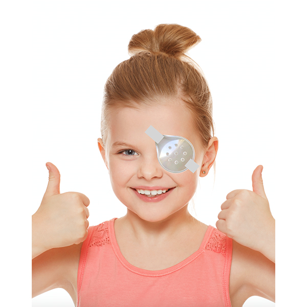 Eye shields are used after surgery to protect the eye and hold dressings in place. They are made of clear shatterproof plastic in a universal shape for use over either eye. Holes in the eye shield provide ventilation.