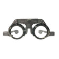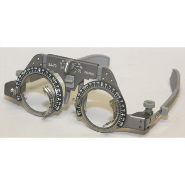 This lightweight frame supports PD adjustable 54 to 70mm. Lenses can be rotated for Astigmatism. The nose pad adjusts with a slide bar. Includes temple length adjustment. Temples are slightly sprung to help keep them on the patient. Accommodates up to four standard trial lenses on each side.