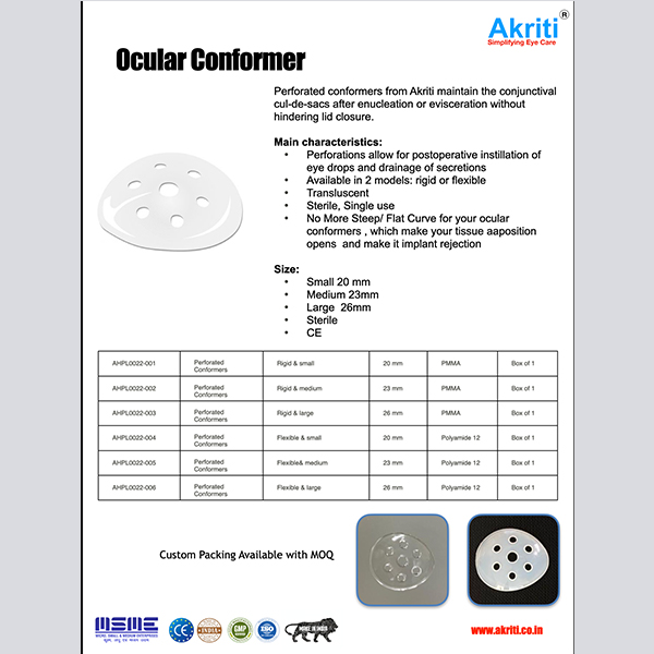 Perforated conformers from Akriti maintain the conjunctival cul-de-sacs after enucleationΒ or evisceration without hindering lid closure.