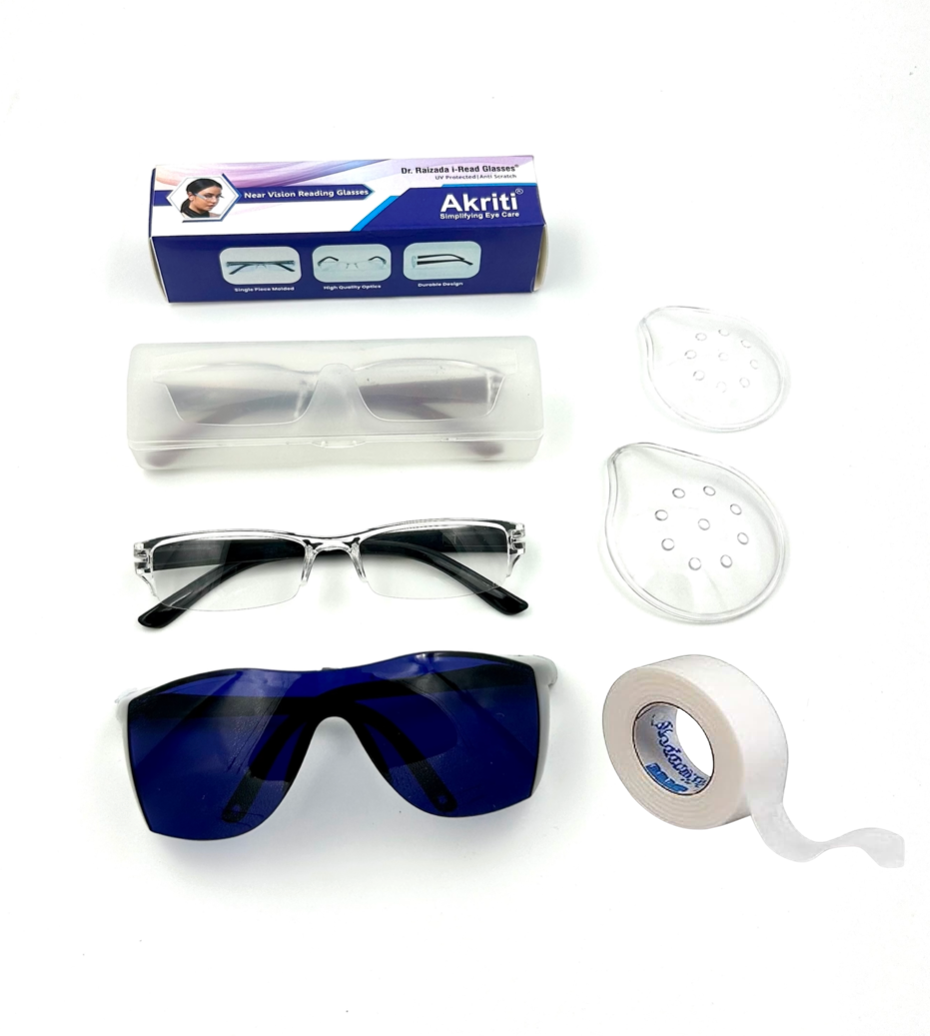 - Our Post Op Cataract Kits contain Large or Medium UV400 Cataract glasses, a wrapped polycarbonate eye shield, and Hypoallergenic paper tape (30ft).