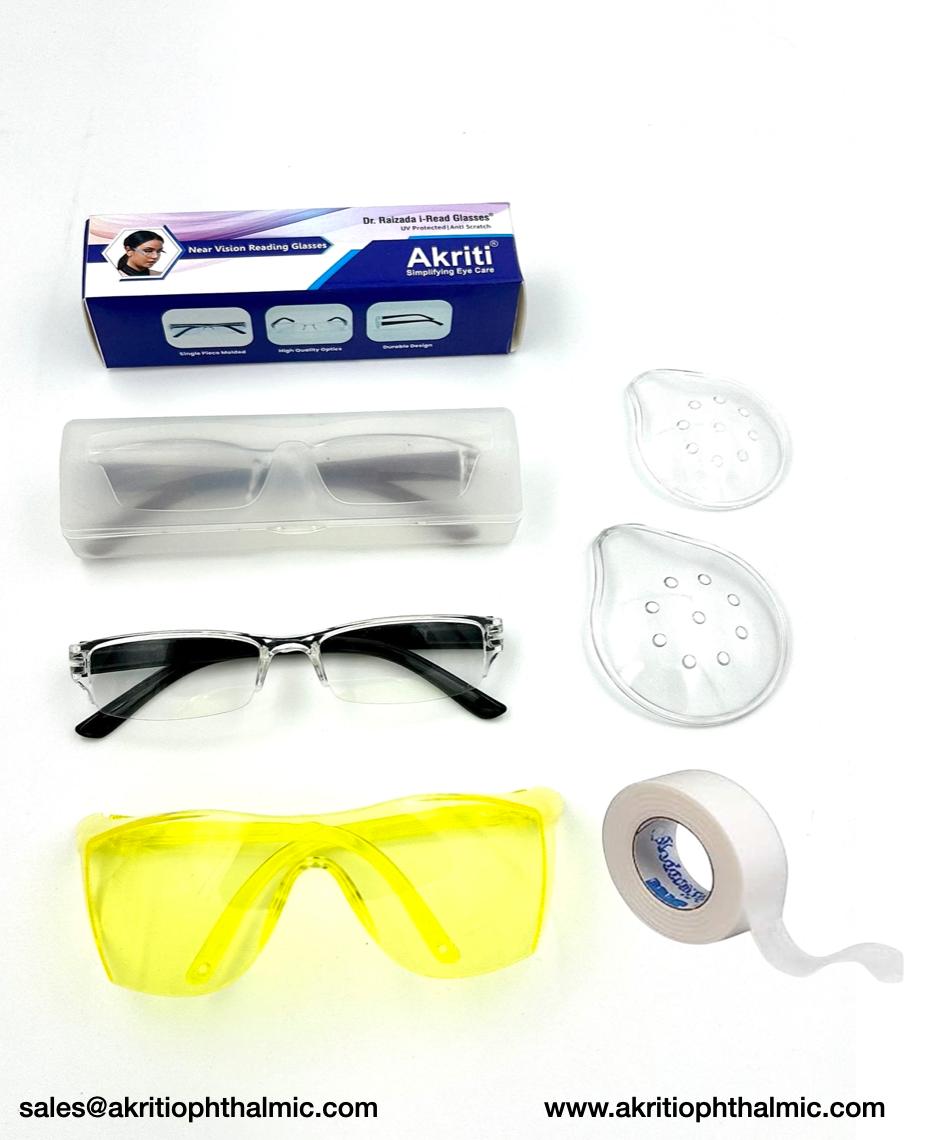 - Our Post Op Cataract Kits contain Large or Medium UV400 Cataract glasses, a wrapped polycarbonate eye shield, and Hypoallergenic paper tape (30ft).