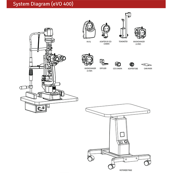 The eVO 400 delivers a streamlined design with high precision apochromatic optics for accurate anatomical observations, corrected for spherical and chromatic aberrations to ensure comfortable and reliable use. Eco-friendly illumination options, lead-free high dispersion glass, paints and materials minimize the system's environmental impact without sacrificing performance and durability. The eVO 400 represents all that a slit lamp should be.