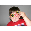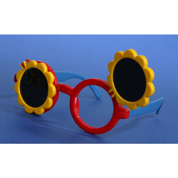 Bright red frames with Yellow Flower flip up occluding lenses. Use with 3-6 year olds. Supports 55mm to 65mm PD. Solid construction.