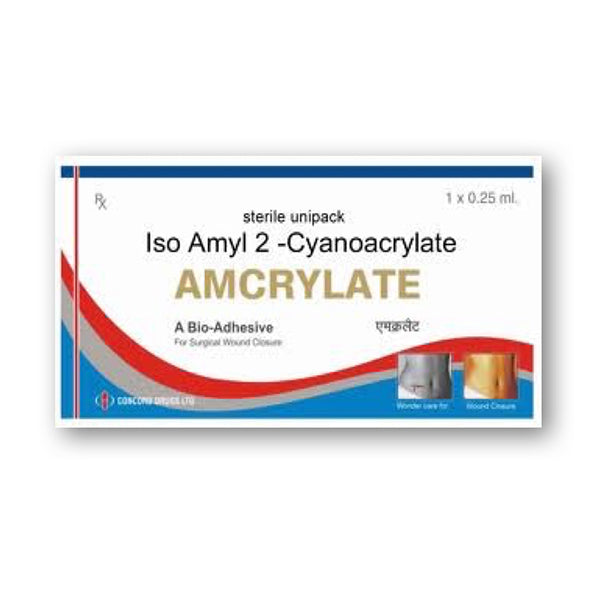 AMCRYLATE is a free flowing liquid monomer (AMCRYLATE Iso Amyl 2-Cyanoacrylate,) to spread easily in between the two skin lesions of the wound to be closed and holdstightly and permanently.
