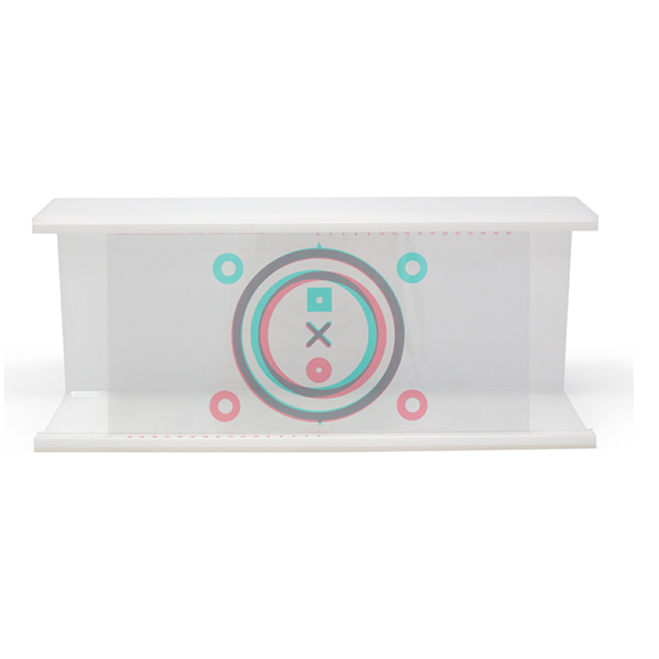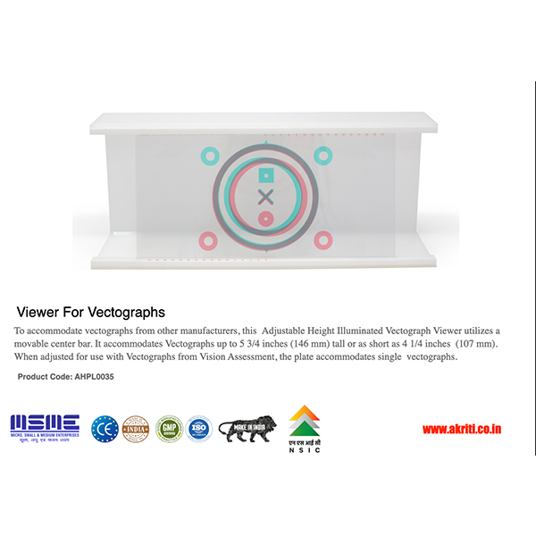 To accommodate vectographs from other manufacturers, Vectograph Viewer utilizes a movable center bar. It accommodates Vectographs up to 5 3/4 inches (146 mm) tall or as short as 4 1/4 inches (107 mm). When adjusted for use with Vectographs from Vision Assessment, the plate accommodates two vectographs. It permits use of a Wolff Wand in behind the Vectograph.